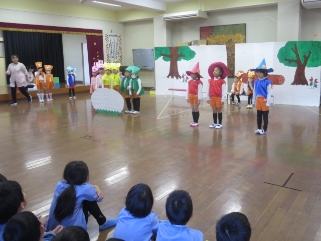 第46回竹の子フェスティバルから早くも一週間が経過 竹の子たちは余韻を楽しむように踊ったり台詞を言ったり ただ一週間前の本番を風邪で出演できなかった年長さんが二人 さぞや残念がっているのではと担任が発案し 本日は欠席年長さんの保護者をご招待し遊戯室でミニフェスを開催 劇と遊戯を観てもらいましたよ 会場は小さくなったものの竹の子たちは全員が大満足でした